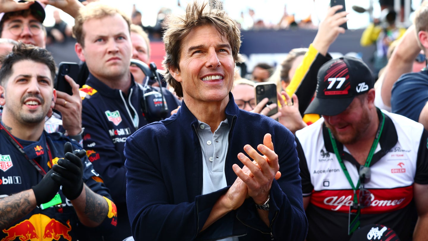টম ক্রুজ ইংল্যান্ডের নর্থহ্যাম্পটনে 3 জুলাই, 2022 -এ সিলভারস্টনে গ্রেট ব্রিটেনের এফ 1 গ্র্যান্ড প্রিক্স চলাকালীন পডিয়াম উদযাপনে প্রশংসা করেছেন। (মার্ক থম্পসন/গেটি চিত্র)