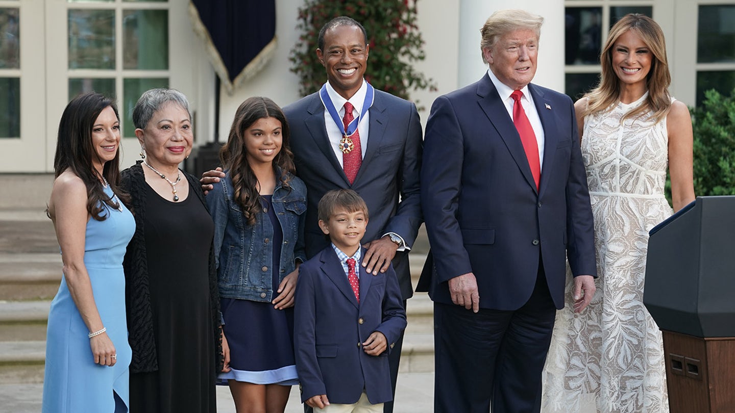 বাম দিক থেকে, এরিকা হারমান, কুলিদা উডস, স্যাম অ্যালেক্সিস উডস, চার্লি অ্যাক্সেল উডস, টাইগার উডস, প্রেসিডেন্ট ডোনাল্ড ট্রাম্প এবং ফার্স্ট লেডি মেলানিয়া ট্রাম্প হোয়াইট হাউসে মেডেল অফ ফ্রিডম অফ দ্য হোয়াইট হাউসে উপস্থাপনের পরে ছবি তোলার পরে, 2019 সালের মে, 2019 । (চিপ সোমোডেভিলা/গেটি চিত্র)